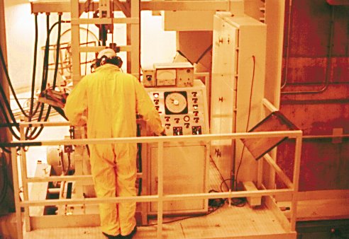 CANDU and RBMK reactors allow on-line refuelings. On-line refueling may replace 1 to 3 fuel assemblies per day depending on the type and size of the reactor and the number of fuel assemblies. The photo to the left shows the refueling machine used to remove fuel assemblies from the reactor. Boiling and Pressurized water reactors must be shutdown to perform the refueling. During a refueling shutdown, 25 to 40% of the fuel assemblies may be replaced. The number replaced depends on the cycle length and number of fuel assemblies in the reactor. |